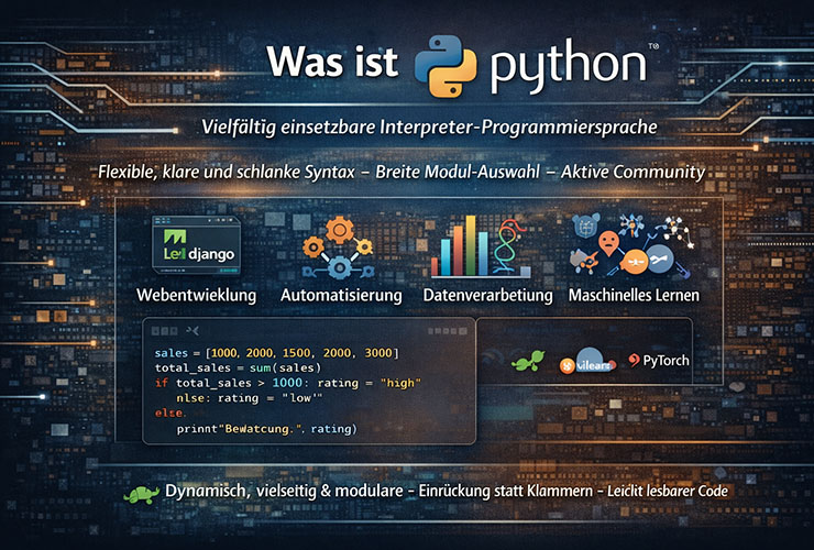 Was ist Python? Python ist eine vielfältig einsetzbare Interpreter- Programmiersprache*. Sie zeichnet sich durch vergleichsweise klare Syntax und hohe Modularität, eine breite Auswahl an Standardmodulen und eine aktive Community aus, durch die vielfache weitere Module bereitstehen.